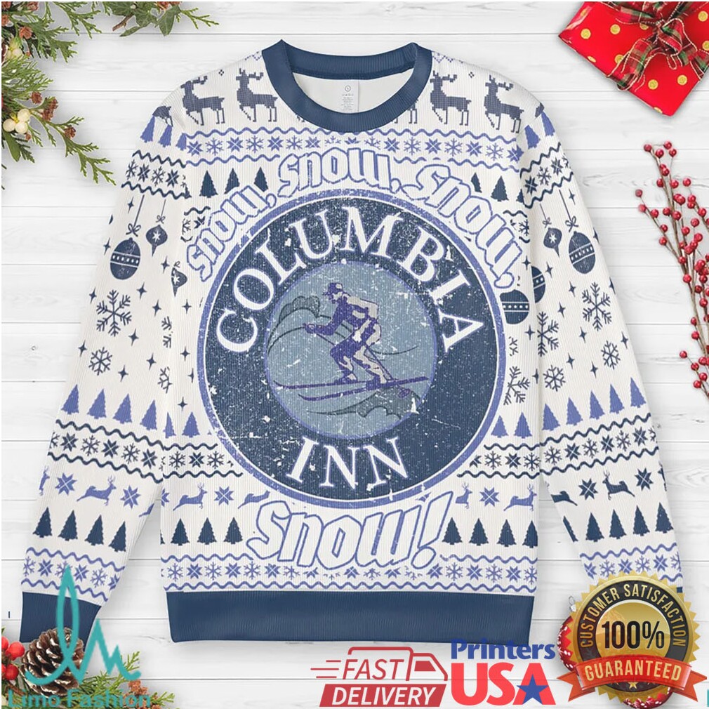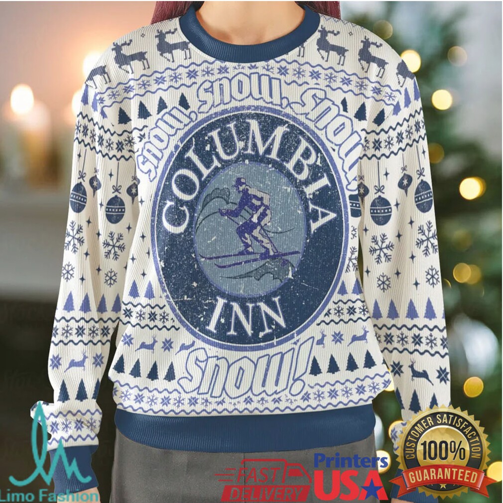 To ensure your Columbia Inn White Christmas Ugly Christmas Sweatshirt remains a holiday favorite, wash it inside out with similar colors in cold water. Tumble dry on a low setting or lay flat to dry. Avoid ironing directly on the design to protect the festive artwork.