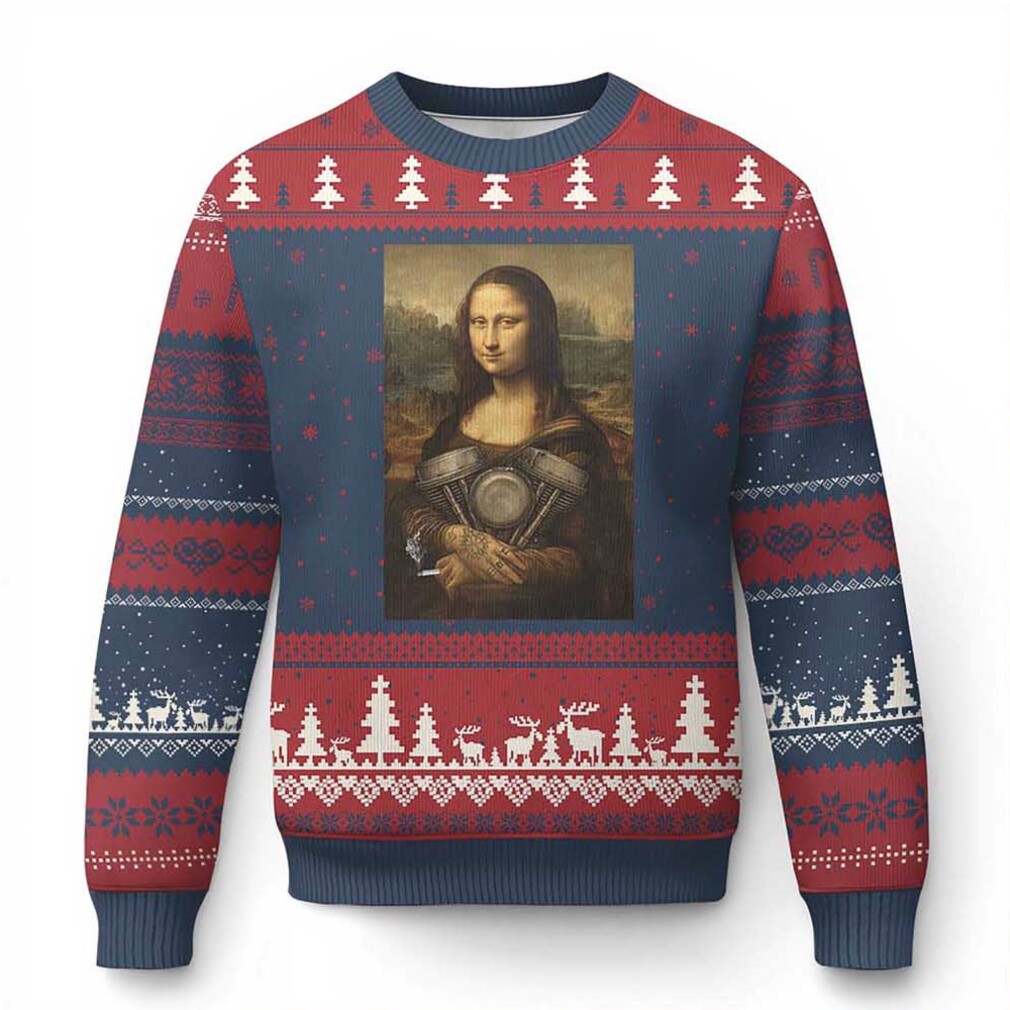 This ain’t your grandma’s Christmas sweater! Imagine showing up at the holiday party rocking Mona Lisa on a motorcycle – instant legend status achieved. This sweater solves the problem of boring holiday outfits, offering a unique value proposition: combining fine art, a love for motorcycles, and the festive spirit. It’s made with a comfortable, quality blend perfect for those chilly nights, and the fit is true to size. Prepare for roaring laughter and unforgettable memories!