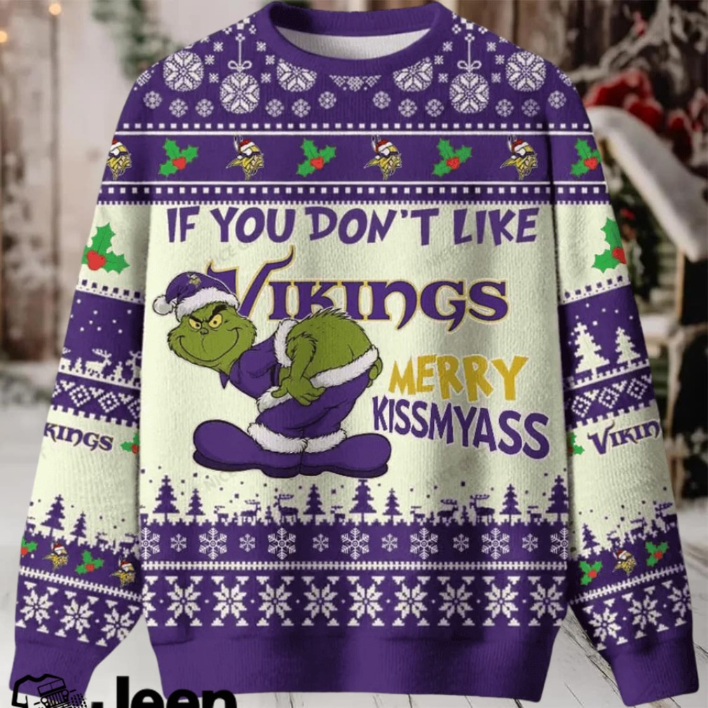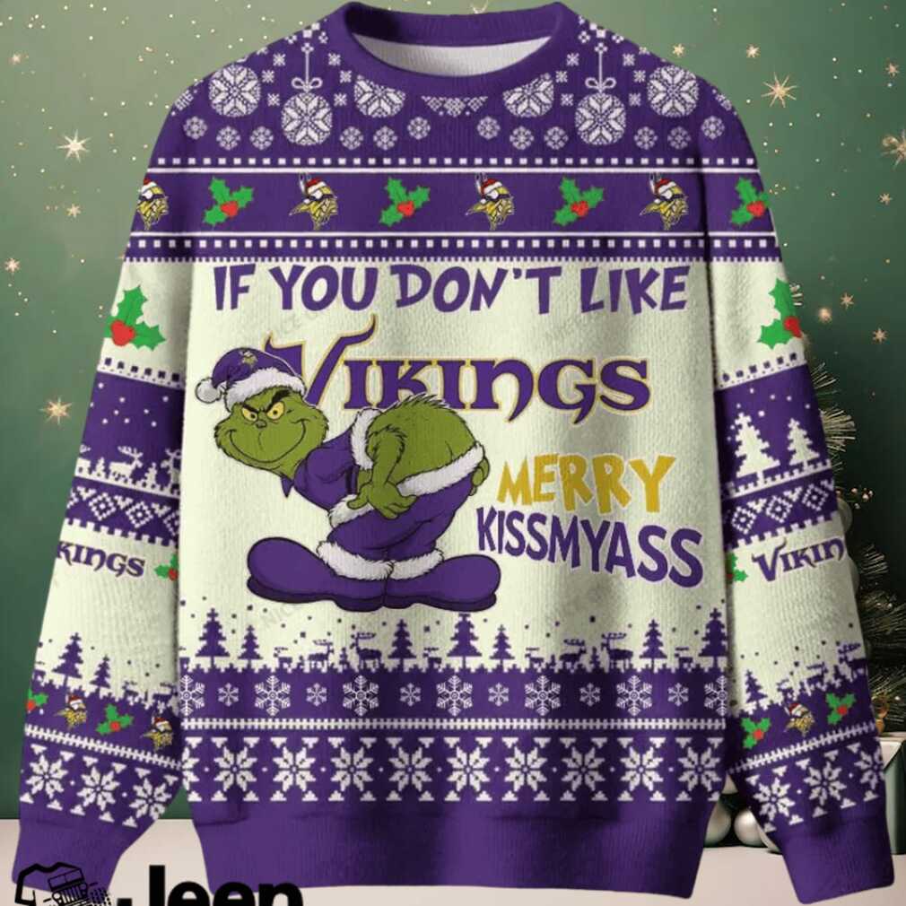 This NFL Minnesota Vikings If You Don’t Like Vikings Merry Kissmyass Ugly Sweater.jfif is more than just a piece of fan apparel; it’s a testament to your unwavering loyalty and playful spirit. Made from a cozy, soft cotton blend, it ensures comfort whether you’re at US Bank Stadium or a festive family gathering. The vibrant print showcases a fun, spirited message that will resonate with any proud Vikings supporter. It’s designed to be durable, maintaining its festive charm and bold message wash after wash. Available in various sizes, it offers a relaxed fit that’s perfect for layering or wearing on its own.