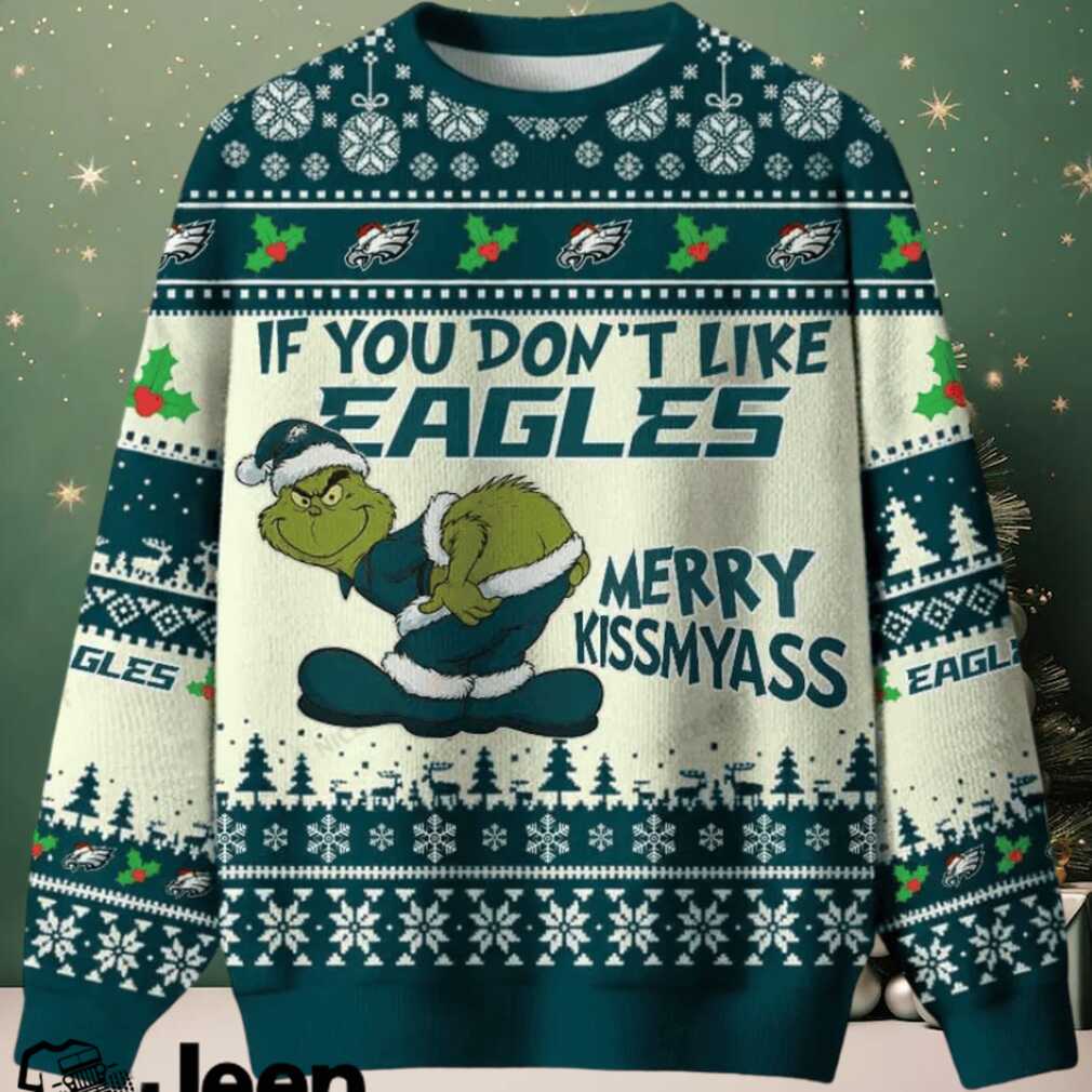 The ‘NFL Philadelphia Eagles If You Don’t Like Eagles Merry Kissmyass Ugly Sweater’ is tailor-made for the most passionate Eagles fans – the ones who bleed green, even during the holiday season. It’s fantastic for wearing to your annual ugly Christmas sweater party, tailgating before a game, or simply making a bold statement around town. This sweater is also the perfect gift for any Philadelphia Eagles fan who appreciates humor and isn’t shy about their team pride. Surprise a loved one with a present that’s both festive and full of personality. It’s an unforgettable way to celebrate the holidays and your favorite NFL team all at once.