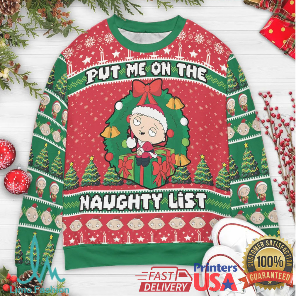 To ensure your “Put Me On The Naughty List Stewie Family Guy Ugly Christmas Sweatshirt” remains a holiday highlight, wash it inside out with cold water and similar colors. Tumble dry on a low setting or air dry. Avoid ironing directly on the graphic to maintain its sharp, humorous design for many seasons of festive mischief.