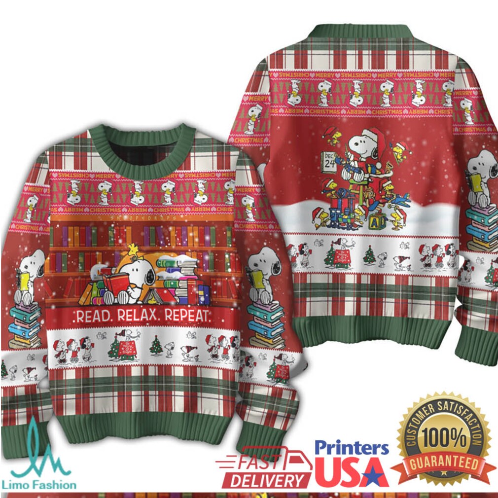 What Makes This Read. Relax. Repeat Snoopy’s Bookworm Christmas Ugly Sweater Epic